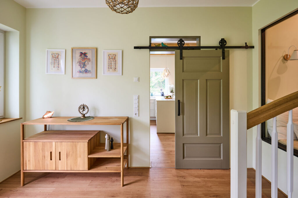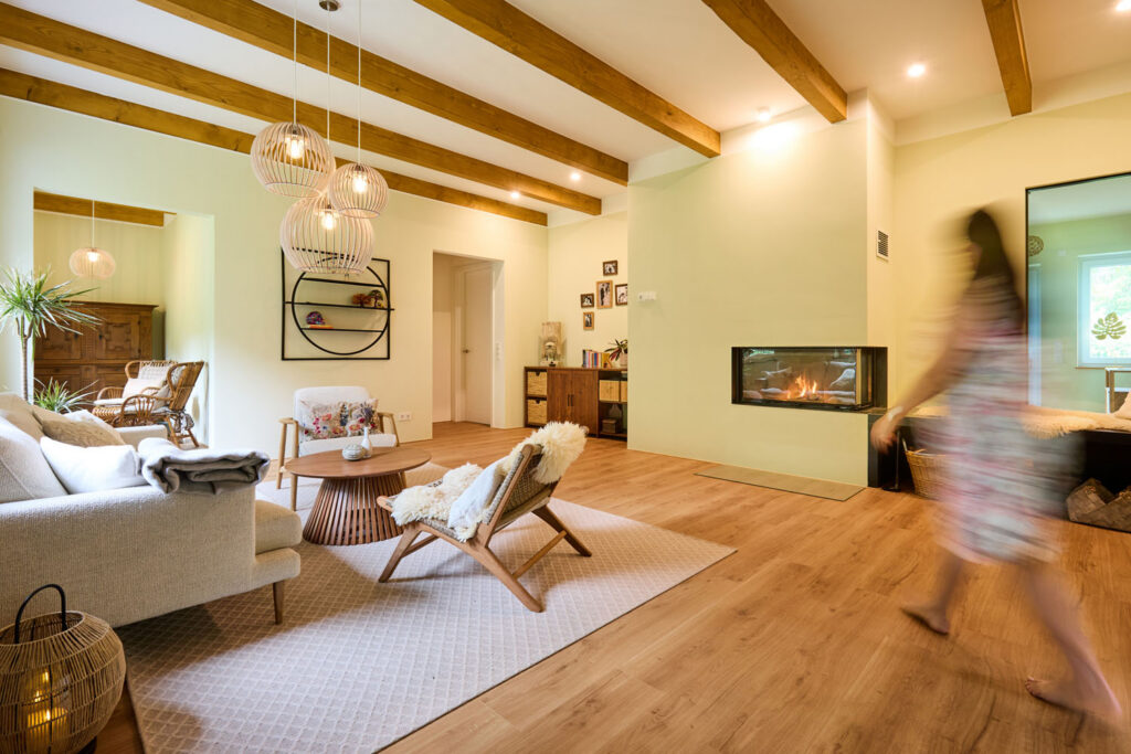 Bis auf die steinernen Grundmauern ließen Sebastian und Yamel den alten Kotten zurückbauen. Das hatte auch energetische Gründe, denn das Paar legte Wert auf eine zeitgemäße Wärmedämmung. Mit dem Wärmedämm-Verbundsystem Qju von Brillux fanden sie das passende Material, um die Fassade energieeffizient zu gestalten. Auch den ehemaligen Kamin ersetzten sie durch eine moderne, gläserne Alternative. Seine Bedeutung ist jedoch gleichgeblieben: Häufig genießen Sebastian und Yamel die gemeinsame Zeit am Feuer, lesen ein Buch oder spielen Gitarre. „Wer braucht da schon einen Fernseher?“, lacht Sebastian. „Wir nutzen die Wand lieber für Fotos unserer unzähligen Reisen nach Lateinamerika.“ Diese Erinnerungsstücke kommen bei der konsistenten Wandgestaltung des Hauses besonders zur Geltung. Das liegt unter anderem an dem angebrachten Wandbelag „Xtravlies“ von Brillux, der die Grundlage für die glatten und strapazierfähigen Oberflächen bildet. Bei der weiteren Wandgestaltung setzte das Paar auf „Superlux 3000“. Als Farbe wählten Sebastian und Yamel einen warmen, sanften Grünton aus. Dieser zieht sich durch das gesamte Haus und harmoniert bestens mit den natürlichen Sand- und Cremetönen der Inneneinrichtung. Auch das Holz der Deckenbalken und das Laminat in Holzoptik schaffen eine verbindende Konstante der Räume. Die Oberflächen erinnern an die umliegende Natur, die das Paar so liebt.
