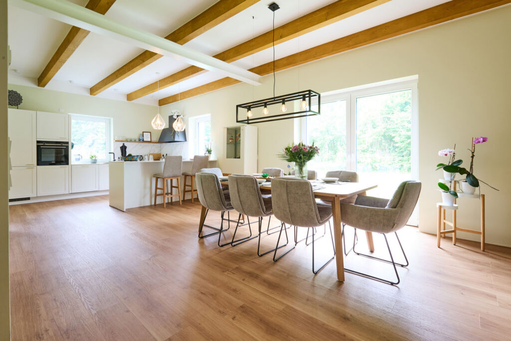 Geschichte und Modernität, jung und alt, mexikanisch und deutsch – der Kotten ist in Sebastians und Yamels Leben ein wichtiges Verbindungselement. Offenheit und Begegnung prägen das Konzept der Raumaufteilung und Inneneinrichtung. Besonders deutlich zeigt sich das im großzügigen Wohn-Essbereich. Dieser bildet mit seiner offenen Küche und der langen Tafel den zentralen Treffpunkt des Hauses. „Hier wird gemeinsam gekocht, gespielt und geredet“, sagt Sebastian. „Wir sitzen dort oft stundenlang mit unserem Besuch.