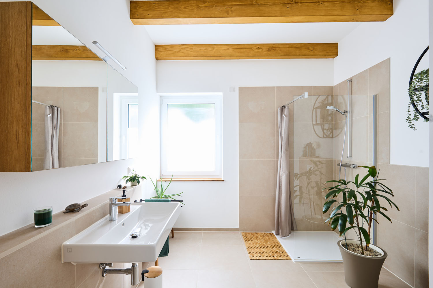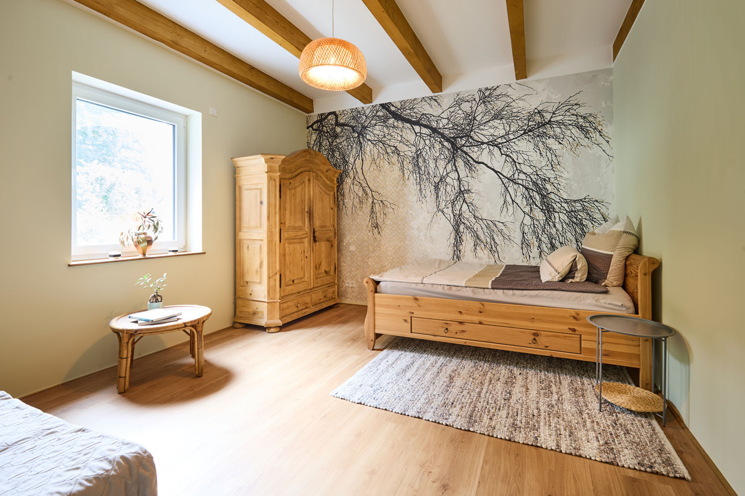 Für die Unterbringung ihrer Gäste ist ebenfalls bestens gesorgt: Weil Yamels Familie aus Mexiko das Paar häufig besucht und es auch bei längeren Aufenthalten so bequem wie möglich haben soll, widmeten die Hausbesitzer der Gestaltung des Gästezimmers besondere Aufmerksamkeit. Das großzügige Zimmer mit Bett und Sofa im grün-beigen Stil der restlichen Räume lässt die Besuchenden sich heimisch fühlen. Eine Digitaldrucktapete in Baumoptik holt die Natur ins Haus und schafft somit eine besondere Wohlfühlatmosphäre. Angrenzend befindet sich ein helles und modernes Badezimmer: Die Gäste verfügen über einen eigenen Bereich, sodass sie auch bei längeren Aufenthalten Komfort genießen.