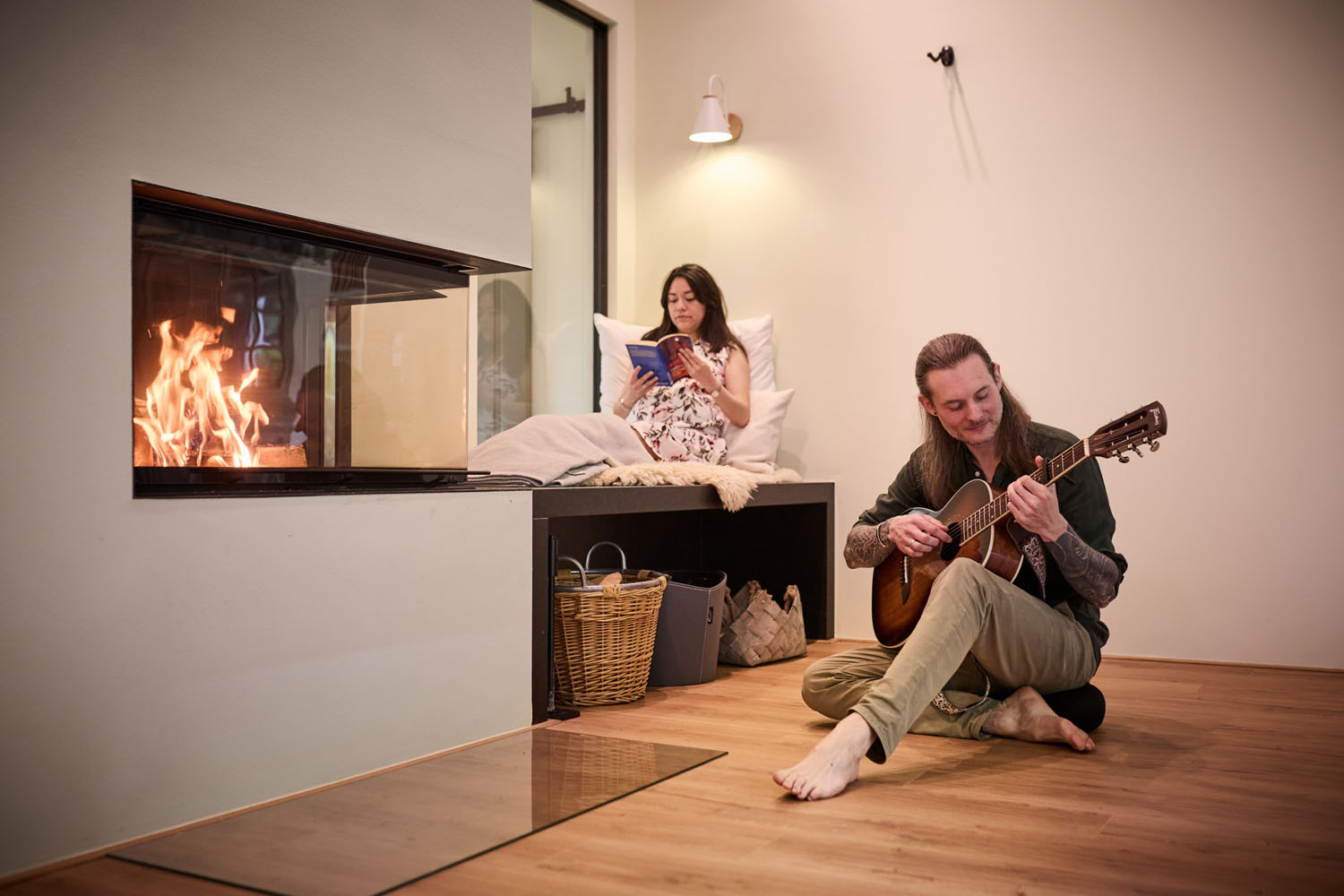 Bis auf die steinernen Grundmauern ließen Sebastian und Yamel den alten Kotten zurückbauen. Das hatte auch energetische Gründe, denn das Paar legte Wert auf eine zeitgemäße Wärmedämmung. Mit dem Wärmedämm-Verbundsystem Qju von Brillux fanden sie das passende Material, um die Fassade energieeffizient zu gestalten. Auch den ehemaligen Kamin ersetzten sie durch eine moderne, gläserne Alternative. Seine Bedeutung ist jedoch gleichgeblieben: Häufig genießen Sebastian und Yamel die gemeinsame Zeit am Feuer, lesen ein Buch oder spielen Gitarre. „Wer braucht da schon einen Fernseher?“, lacht Sebastian. „Wir nutzen die Wand lieber für Fotos unserer unzähligen Reisen nach Lateinamerika.“ Diese Erinnerungsstücke kommen bei der konsistenten Wandgestaltung des Hauses besonders zur Geltung. Das liegt unter anderem an dem angebrachten Wandbelag „Xtravlies“ von Brillux, der die Grundlage für die glatten und strapazierfähigen Oberflächen bildet. Bei der weiteren Wandgestaltung setzte das Paar auf „Superlux 3000“. Als Farbe wählten Sebastian und Yamel einen warmen, sanften Grünton aus. Dieser zieht sich durch das gesamte Haus und harmoniert bestens mit den natürlichen Sand- und Cremetönen der Inneneinrichtung. Auch das Holz der Deckenbalken und das Laminat in Holzoptik schaffen eine verbindende Konstante der Räume. Die Oberflächen erinnern an die umliegende Natur, die das Paar so liebt.