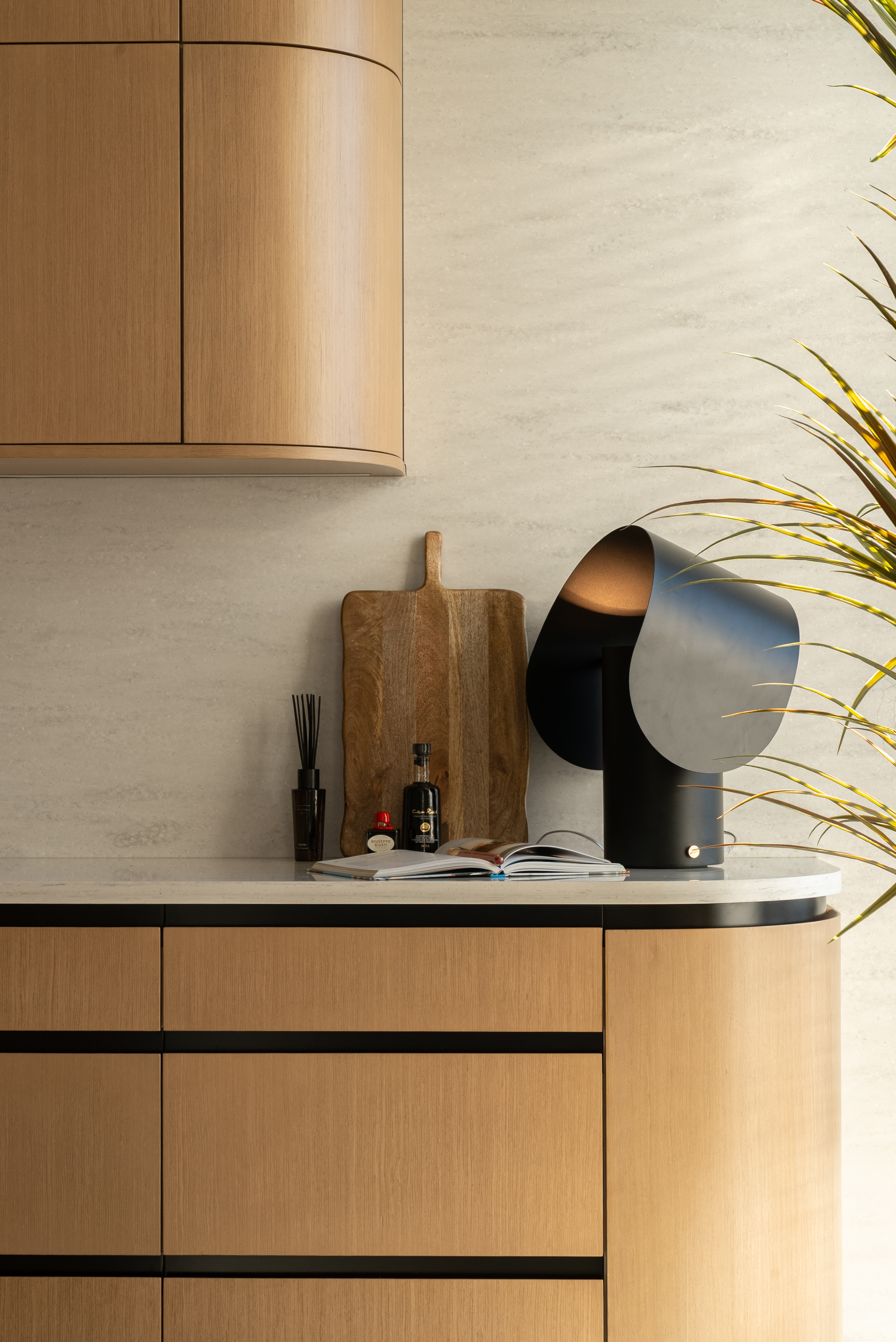 Im Zentrum des auf Harmonie und Miteinander ausgerichteten Grundrisses steht die Küche als Herzstück des familiären Zusammenlebens. Ein Ende der Kücheninsel ist sanft abgerundet – ein organisches Detail, das die Raumdynamik betont und einen feinen Kontrast zu den überwiegend geradlinigen Formen bildet. Die Spüle ist nahtlos in die Arbeitsplatte integriert und unterstreicht die Klarheit und Funktionalität. Gezielt gesetzte dunklere Details und Akzente, kombiniert mit den warmen Holzoberflächen der Schränke und Stauraumelemente, schaffen einen reizvollen Kontrast und machen die Küche zum kommunikativen Mittelpunkt des Wohnbereichs.