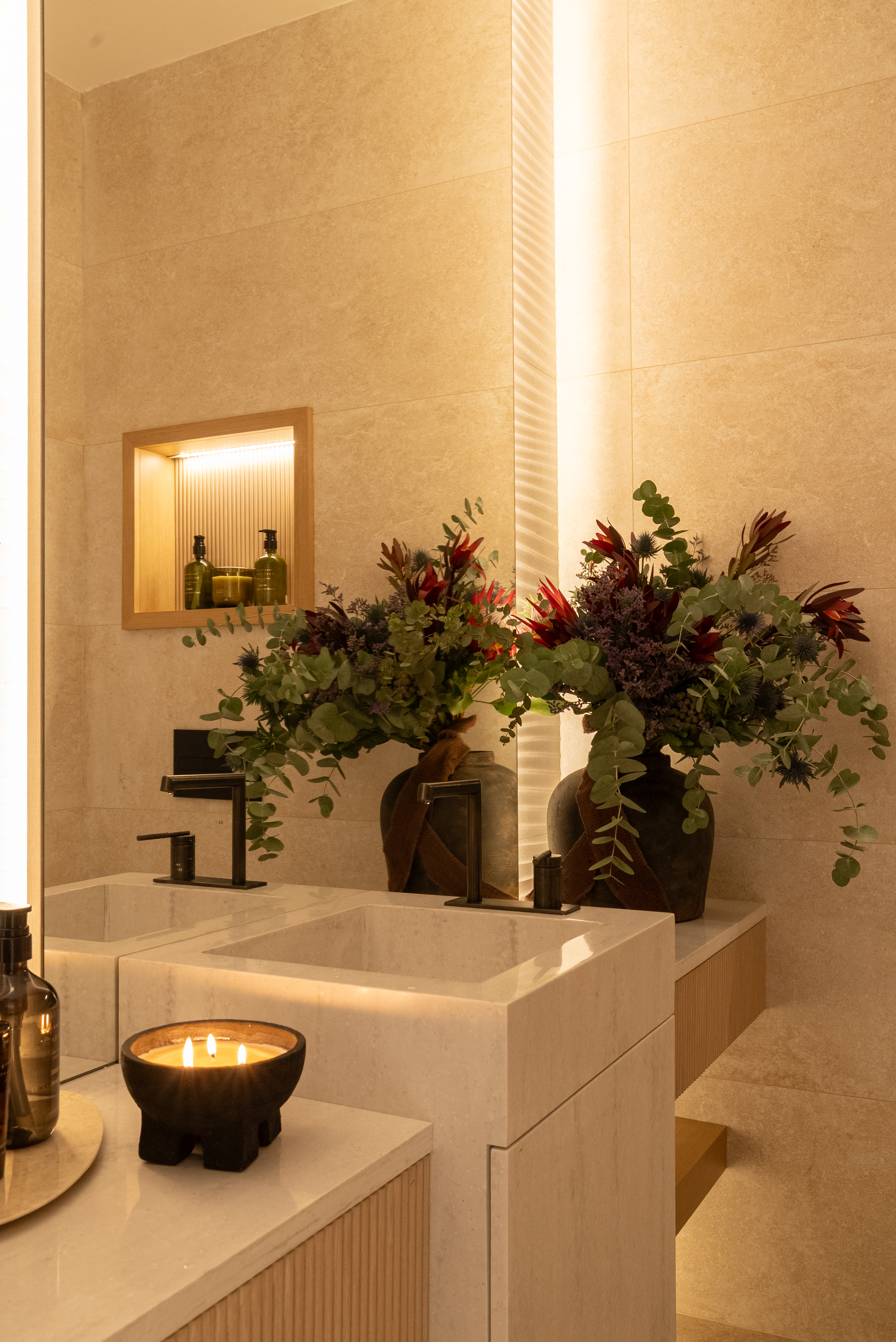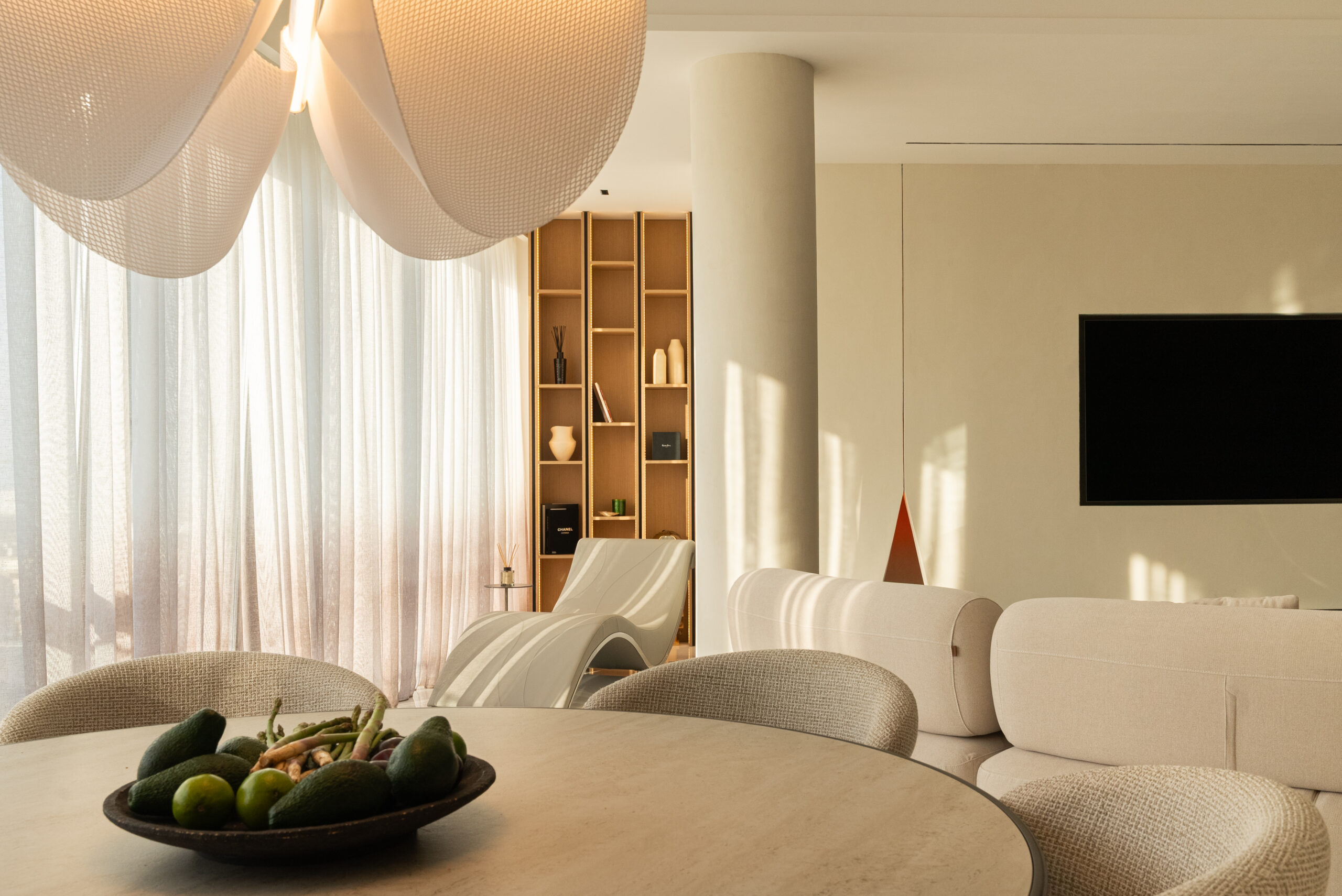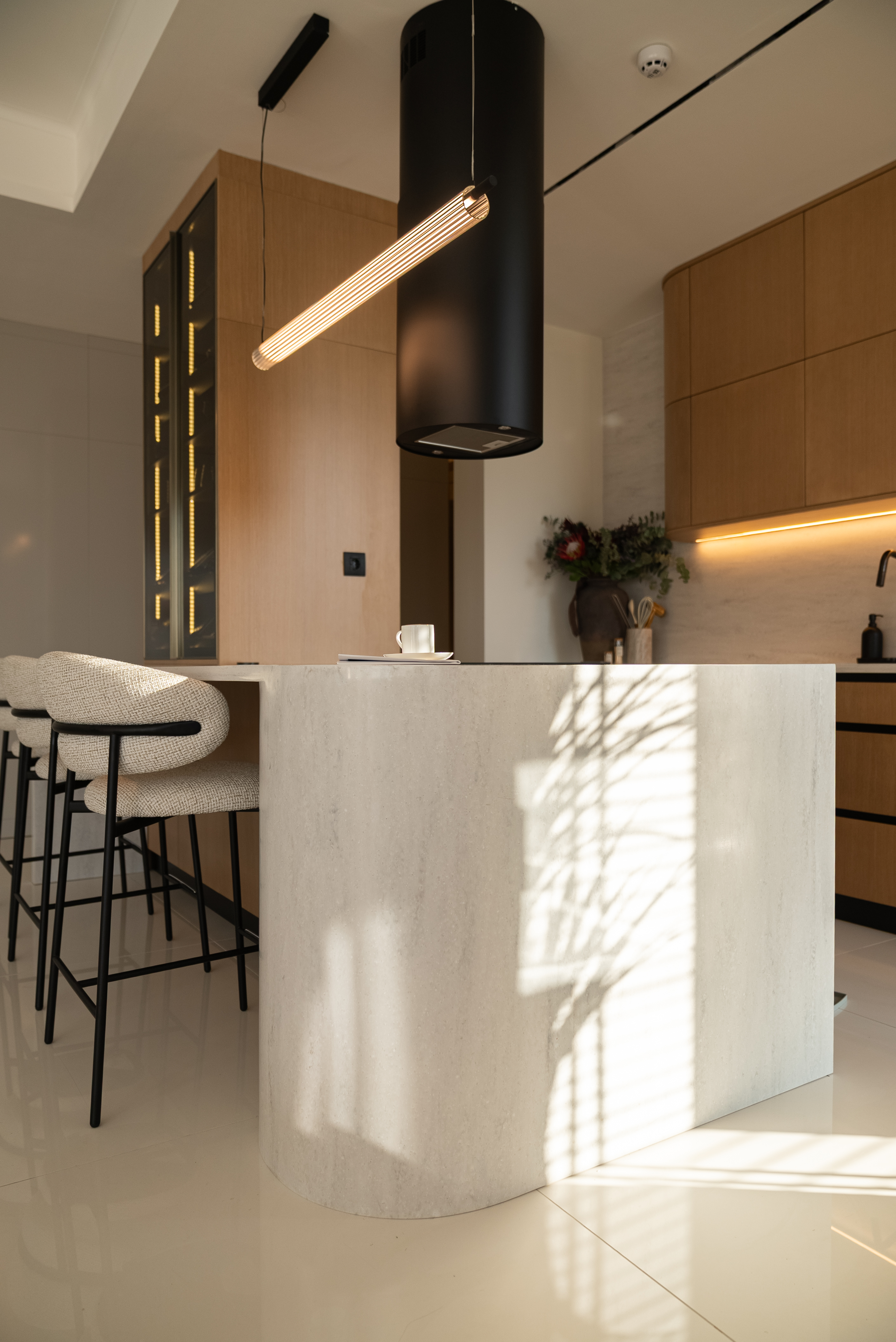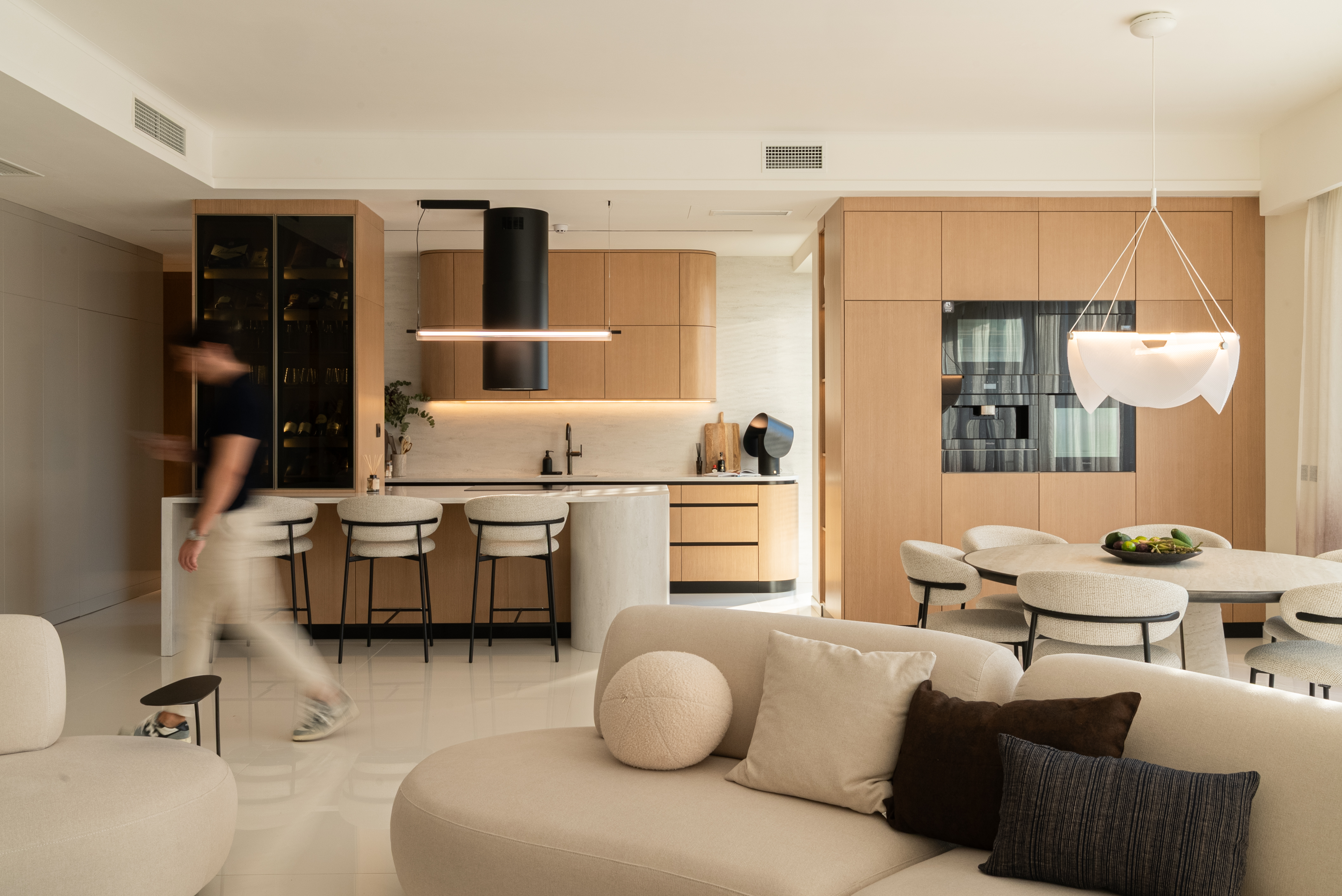 Für die Eigentümerfamilie, die das 210 Quadratmeter große Apartment bewohnt, spielte das Thema Licht eine zentrale Rolle – als Ausdruck einer ausgewogenen Verbindung von Funktionalität und Ästhetik. Der Wunsch nach einem großzügigen, lichtdurchfluteten Zuhause mit neutralen Tönen und sanften Farben, die Ruhe und Weite vermitteln, bestimmte die Gestaltung. Besonders wichtig war dabei ein offenes Raumkonzept, das eine natürliche Verbindung und Kommunikation zwischen den Wohnbereichen ermöglicht – für eine Umgebung, in der sich Familie und Freunde gleichermaßen wohlfühlen.