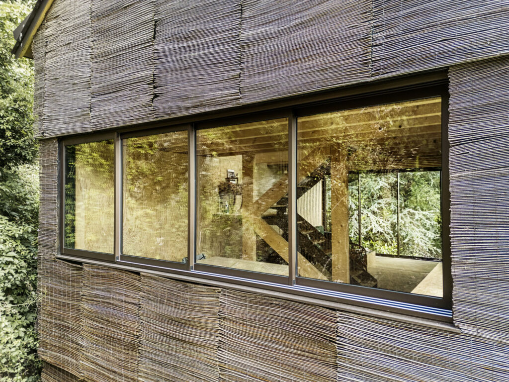 Präzise sind die Fenster des Hauses gesetzt. Sie machen deutlich, wie gut die Architekten die Umgebung verstanden und wie klar sie mit ihrem Entwurf auf diese reagiert haben. Es sind die gezielten Blicke in die Natur, die deren Schönheiten festhalten und in den Alltag der Bewohner mischen. In der Küche im Erdgeschoss rahmt ein großes quadratisches Fenster den Blick auf die weniger als einen Meter entfernte, mit Flechten und Moosen bewachsene Felswand – wie ein subtil sich veränderndes Gemälde. Zum Parkplatz zeigt sich das Haus geschlossen, gibt wenig von seinem Innenleben preis. In den Innenräumen vergisst man die Existenz desselben. Schaut man von außen auf die Giebelseiten, scheint das mittlere Stockwerk aufgrund seiner großen, bodengleichen Glasscheiben kaum zu existieren. Hier gehen Innenraum und Außenraum ineinander über. Und letztlich ist da noch das Dachfenster, das über die gesamte Hausbreite viel Licht in die Innenräume holt, mit der Chance, doch noch die Laubkronen der Bäume, die die Loire säumen, zu sehen.