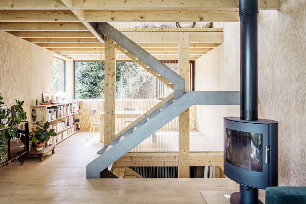 Für das Erdgeschoss ließen die Architekten die Mauern des ehemaligen Gartenhauses stehen, dämmten sie außen und nutzten innen die vorhandenen Anschlüsse für Wasserver- und -entsorgung für Küche und Badezimmer. Holzstützen, die innen vor die Mauern gestellt wurden, tragen die beiden oberen Geschosse, die jeweils um mehr als 25 Zentimeter kaskadenartig hinausragen. In Holzständerbauweise ausgeführt, sind die oberen Außenwände mit Holzwolle ausgefacht und gedämmt. Auch der Dachstuhl ist mit Holz gestaltet. Die oberen zwei Geschosse sind Wohn- und Schlafraum – Räume, deren Atmosphäre von Zurückhaltung und von den Mustern der mit Seekieferplatten beplankten Innenwände geprägt ist.