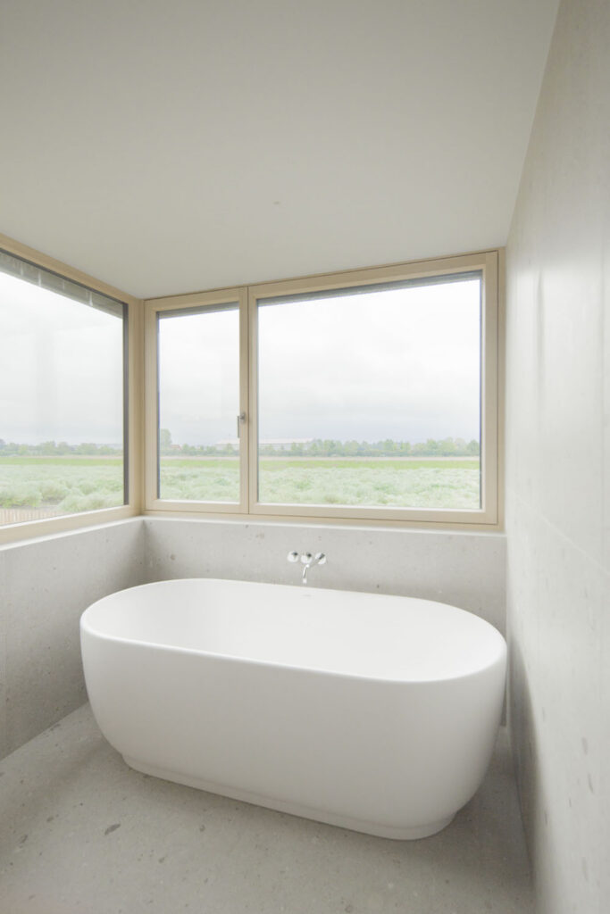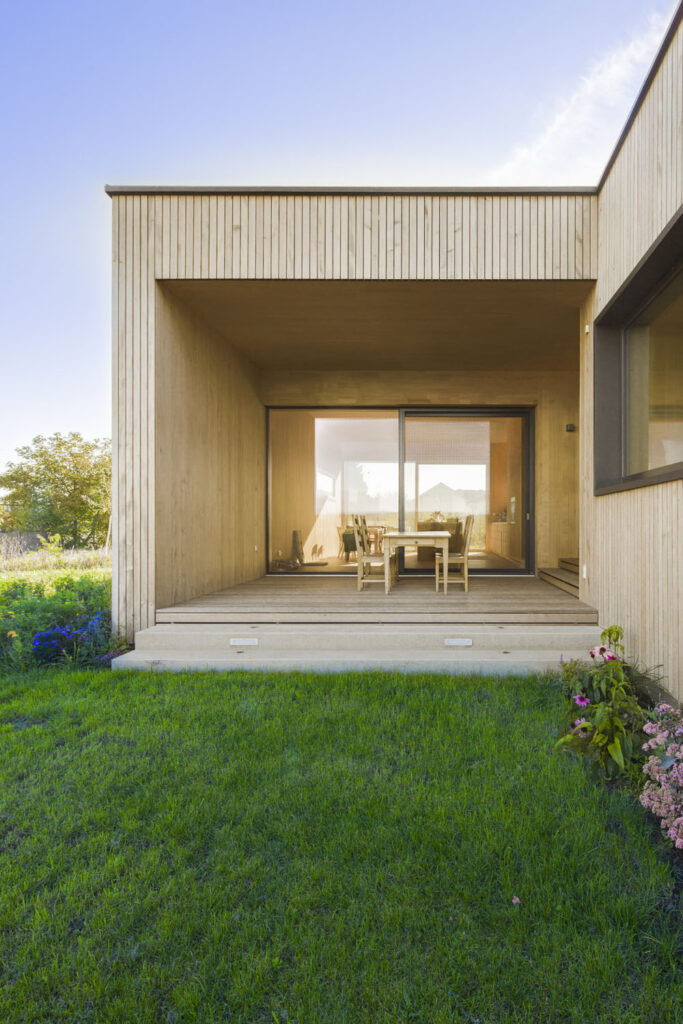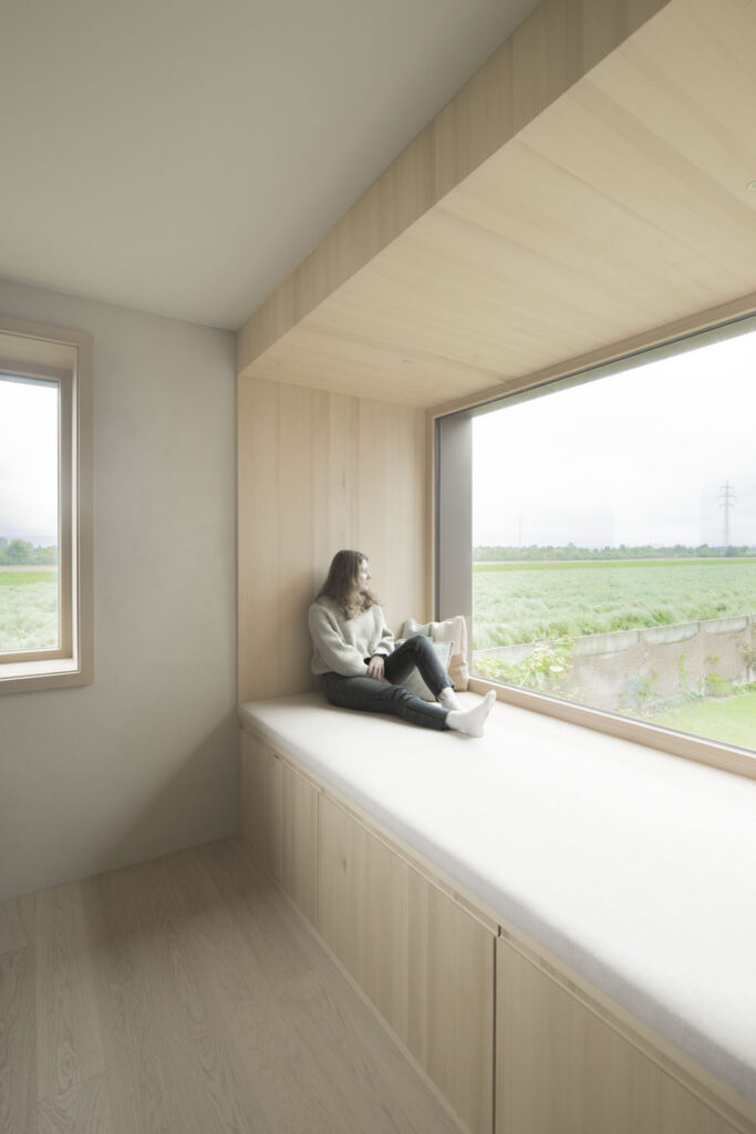 Erschlossen wird der Baukörper über den bestehenden Eingang im Westen. Eine Halbtreppe führt auf die Wohnebene. Straßenseitig haben die Planer Arbeits- sowie Badezimmer angeordnet. Durch den Abriss der Garage gewinnt das Gebäude neue Ausblicke über die Spargelfelder, wohin sich Schlaf- und Wohnzimmer orientieren. Das Gästezimmer ist nach Westen ausgerichtet. Der Zubau im Norden mit Küche und Loggia schafft den Übergang von Wohnebene zu Gartenniveau. Über eine Halbtreppe betreten die Bewohner den eineinhalb geschosshohen Raum. Er wird von Morgen- und Abendsonne durchflutet. Der private Außenbereich im Osten schafft zusätzliche Aufenthaltsqualität.
