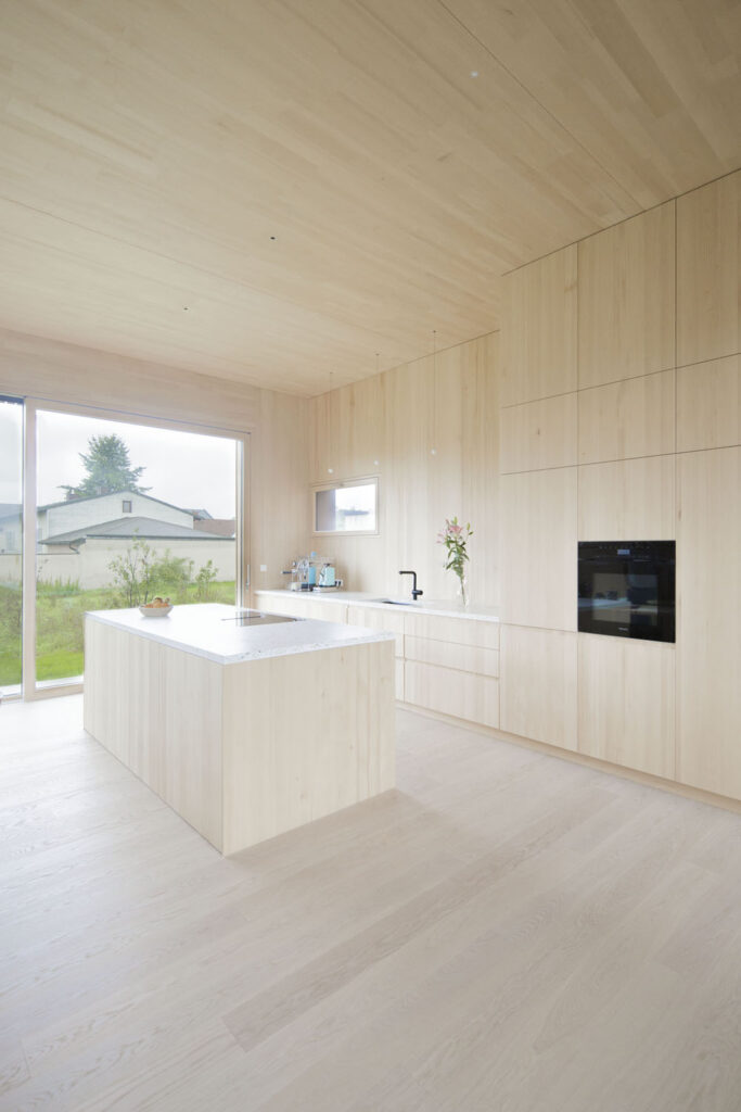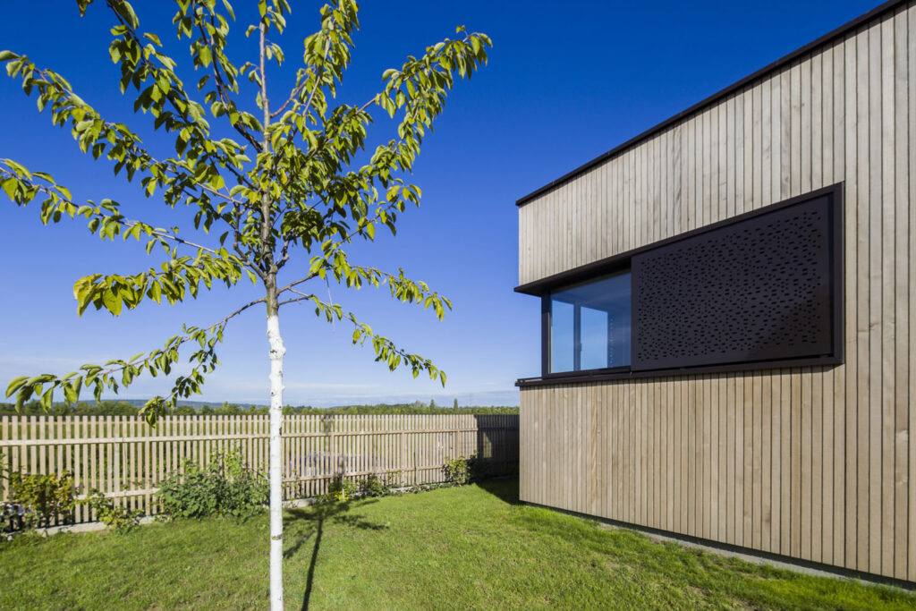 Die äußere Tragstruktur des Bestandsgebäudes haben die Architekten erhalten. Diese wird nun durch eine allseitig umlaufende Holzfassade mit Holzfaserdämmung eingefasst. So wird das Gebäude sowohl gestalterisch als auch energetisch aufgewertet. Eine Photovoltaikanlage ergänzt das Energiekonzept. Perforierte Metallschiebeläden an den Fenstern bieten Sonnenschutz und straßenseitig Privatsphäre. Das Nebengebäude positioniert sich als schlichter Holzkubus neben dem Wohnhaus. Im Innenraum dominieren helle Lehmputzoberflächen. Auch der großzügige Einsatz von Holz an Wänden und Decken hinterlässt eindrucksvolle Spuren: Sie wirkt die moderne Küche von oben bis unten wie aus einem Guss. Für ein behagliches Raumklima sorgen eine Fußbodenheizung sowie ein Kamin. Selbst Vergangenes kommt wieder zum Einsatz und steht einmal mehr für den nachhaltigen Gedanken des Umbaus: zum Beispiel durch Ziegel aus dem alten Bestand.