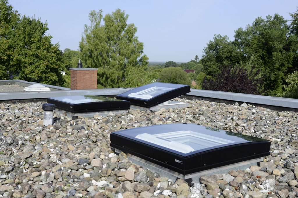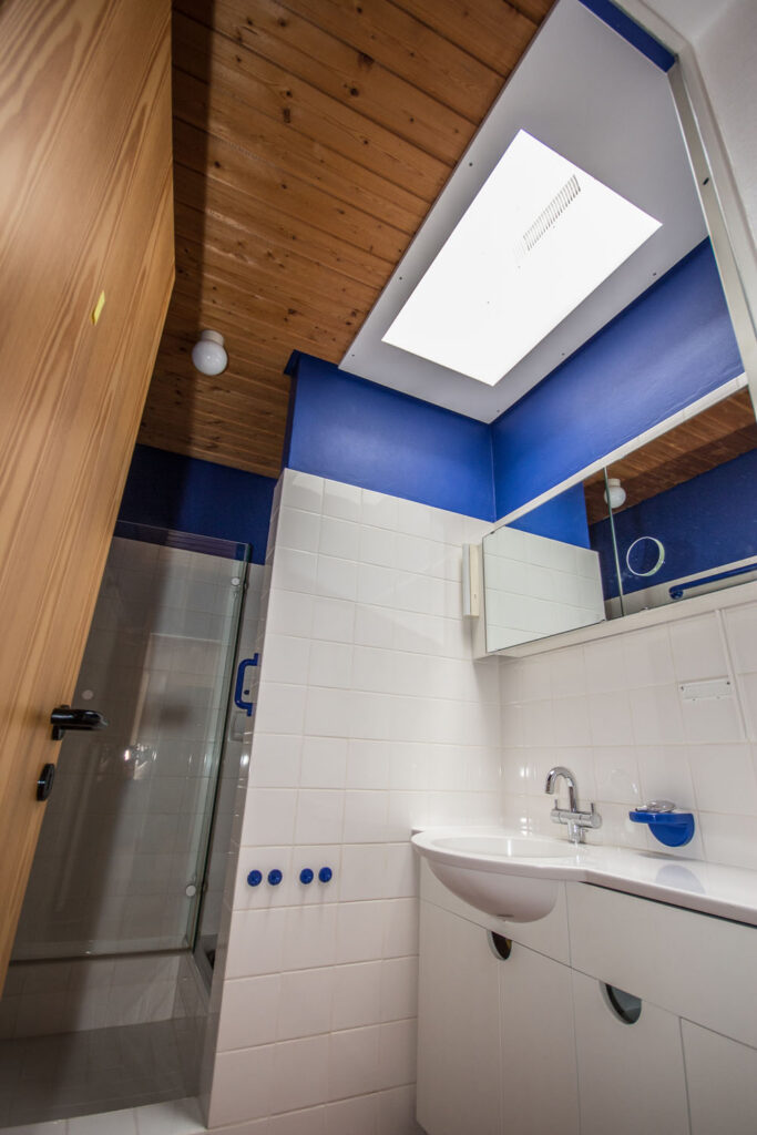 Bereits in den 1990er Jahren erhielt das Flachdach des Hauses eine neue Dachhaut und in diesem Zuge auch drei Lichtkuppeln. Diese wurden bei der Sanierung 2018 gegen Flachdach-Fenster ausgetauscht, von denen zudem auch noch je ein zusätzliches im Bad und Wohn-/Essraum installiert wurde. Sie wählten bewusst ein konvexförmiges Glas. Durch das nur dezent gebogene Glas integrieren sich die Fenster sehr harmonisch in die Dachfläche. Das Regenwasser läuft trotzdem problemlos von der Scheiben-Oberfläche ab. Im ganzen Haus wurden die Leitungen für Wasser und Strom erneuert. Auch kleine Besonderheiten, wie ein Kaminofen mit Bio-Ethanol, wurden in diesem Zuge eingebaut. Da viel in Eigenleistung erbracht wurde, betrugen die Baukosten nicht mehr als 100.000 Euro.