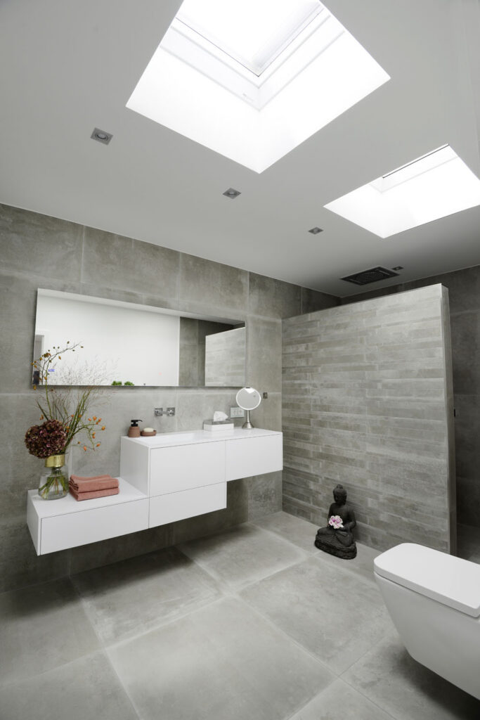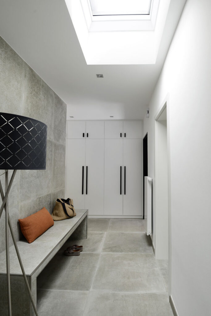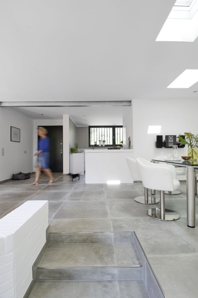 Damit der Bungalow den Ansprüchen der Bewohner entsprechen würde, standen umfassende Modernisierungsarbeiten an. Heute ist er kaum wiederzuerkennen: Dank abgerissener Wände beeindruckt der Kettenbungalow durch einen deutlich offeneren Grundriss mit einem wesentlich größeren Bad. Er wirkt zudem mit seiner modernen hellen Farbgestaltung und Einrichtung, die sich durch das ganze Haus zieht, deutlich freundlicher. Aufgrund der zwei komplett geschlossenen Außenwände und der nur in der Küche für Fenster geöffneten vorderen Hausfront, war es besonders wichtig, zusätzliches Licht in die Tiefe des Raumes zu holen. Dies ist heutzutage dank moderner Oberlichter mit hervorragender Wärmedämmung ohne Einbußen bei der Energieeffizienz eines Hauses möglich.