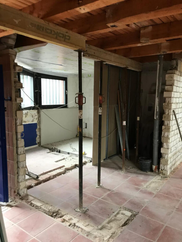 Der Grundriss des Kettenbungalows war zu kleinteilig und einige Bereiche schlicht zu dunkel. Das lag auch an der Bauform dieser speziellen Variante des herkömmlichen Bungalows, der auch unter dem Begriff Reihenbungalow bekannt ist. Die einzelnen Häuser werden bei diesem Gebäudetyp mit jeweils L-förmigen Grundrissen aneinandergebaut. Da die direkt an das Nachbargrundstück grenzenden Mauern jeweils fensterlos sind, entstehen zwischen den einzelnen Baukörpern Freiflächen für Atrien, die mehr Privatsphäre auf dem Grundstück als ein klassisches Reihenhaus bieten.