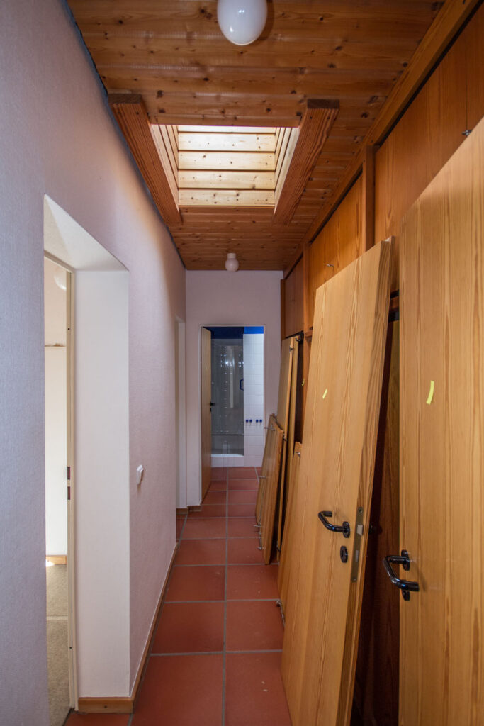 Ein Architekt hatte den Kettenbungalow Mitte der 70er Jahre für sich selbst gebaut und zu diesem Zeitpunkt mit der individuellen Gestaltung den Zeitgeist getroffen. Doch was in den 70er Jahren noch modern war, trifft heute weder aktuelle Wohntrends, noch entsprach es den Vorstellungen der neuen Besitzer. Optisch dominierten roter Backstein, Terrakotta-Fliesen und holzvertäfelte Decken.