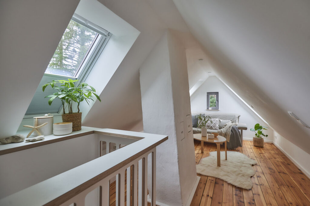 Die Lage war einfach perfekt: im Grünen, nahe des Flusses Wakenitz und die Altstadt in zehn Minuten zu Fuß erreichbar. Das Haus war zwar mit knapp 140 Quadratmeter Wohnfläche mit Abstand das kleinste Haus in einer Gegend, die geprägt von großen Wohlstandswohnbauten vergangener Jahrzehnte ist, und merklich in die Jahre gekommen. Die Familie erkannte aber das Potenzial, dass in dem Siedlerhäuschen steckte. Es bestand großer Renovierungsbedarf, es war zu dunkel und etwas mehr Platz wünschten sie sich auch. Aber die beiden hatten sich schnell in das 1000 Quadratmeter große Grundstück verliebt, dass ihren Kindern endlich den ersehnten Garten zum Spielen bieten konnte. So berieten sie sich mit den Architekten von Mißfeldt Kraß, wie sie das Haus mit einer Sanierung in ein Zuhause verwandeln könnten, dass ihren Vorstellungen entspräche. Es galt ein eigenes Zimmer für beide Kinder, eine offene Küche mit Essplatz, Wohn- und Elternschlafzimmer sowie Familienbad, ein Gästezimmer und -bad in dem alten Haus unterzubringen. Zudem wünschten sich die Bauherren einen Raum, in dem sie auch einmal dem Familientrubel entfliehen und sich zurückziehen könnte. Der Raum dafür war schnell gefunden – der bisher ungedämmte und nur als Speicher genutzte Spitzboden sollte dieser Rückzugsort werden. Mit fünf Dachfenstern verwandelte sich die vorher düstere Abstellfläche in einen hellen Wohlfühlort mit traumhaftem Ausblick in die grüne Umgebung. Damit es im Sommer nicht zu heiß wird, rüsteten sie die auf der Süd/West-Seite gelegenen Dachfenster mit Hitzeschutz-Markisen aus.