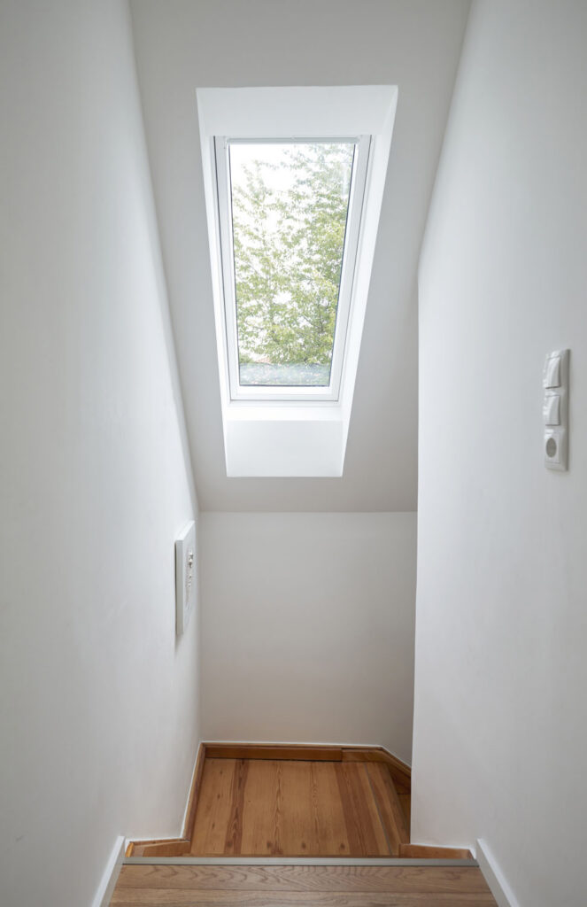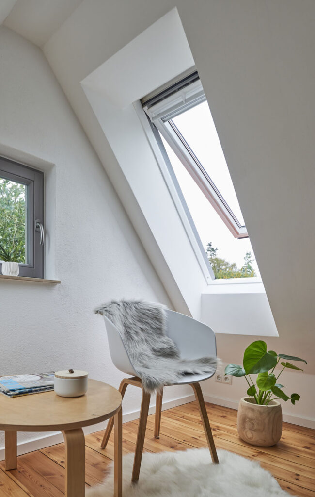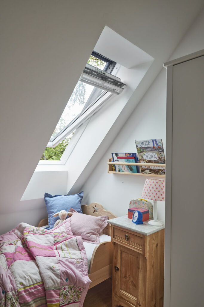 Zusätzliche Fenster in Küche und Diele sowie eine neue Terrassentür im Wohnzimmer sorgen nun für viel Tageslicht. Im Dachgeschoss wurde der Grundriss leicht geändert und die Dachflächen für mehr Tageslicht durch Dachfenster zu öffnen. So wurde etwa eine Wand versetzt, um Platz für ein zusätzliches großes Familienbad zu schaffen. Das ursprüngliche kleine Bad mit WC und Waschbecken wurde modernisiert und das alte Dachfenster gegen eine größeres solarbetriebenes Schwingfenster getauscht. Gerade morgens, wenn sich alle mehr oder weniger gleichzeitig für den Tag fertigmachen müssen, ist die Trennung zwischen Bad und WC besonders praktisch und eine ideale Ausweichmöglichkeit. Das Elternschlafzimmer hält ein kleines Highlight bereit: direkt an den Raum grenzt eine auf dem Anbau eingerichtete Dachterrasse. Auch die beiden Kinderzimmer sind im Dachgeschoss untergebracht. Das Zimmer der Tochter erhält ausreichend Tageslicht durch die Gaube und die Tür des französischen Balkons auf der Giebelseite. Auch im zweiten Kinderzimmer gibt es einen französischen Balkon, allerdings ist die Gaube deutlich kleiner als die im Zimmer der Schwester, so dass es hier ohne weitere Lichtquelle zu dunkel gewesen wäre. Ein zusätzliches Dachfenster sorgt jetzt dafür, dass das Mädchen die Lampen erst in den Abendstunden einschalten muss. „Es war wirklich beeindruckend zu sehen, wie sich der Raum durch das Fenster verändert hat. Es war nicht nur viel heller in dem Zimmer, sondern es entstand ein ganz neues, offenes Raumgefühl“, zeigt sich die Bauherrin begeistert von der Lösung.