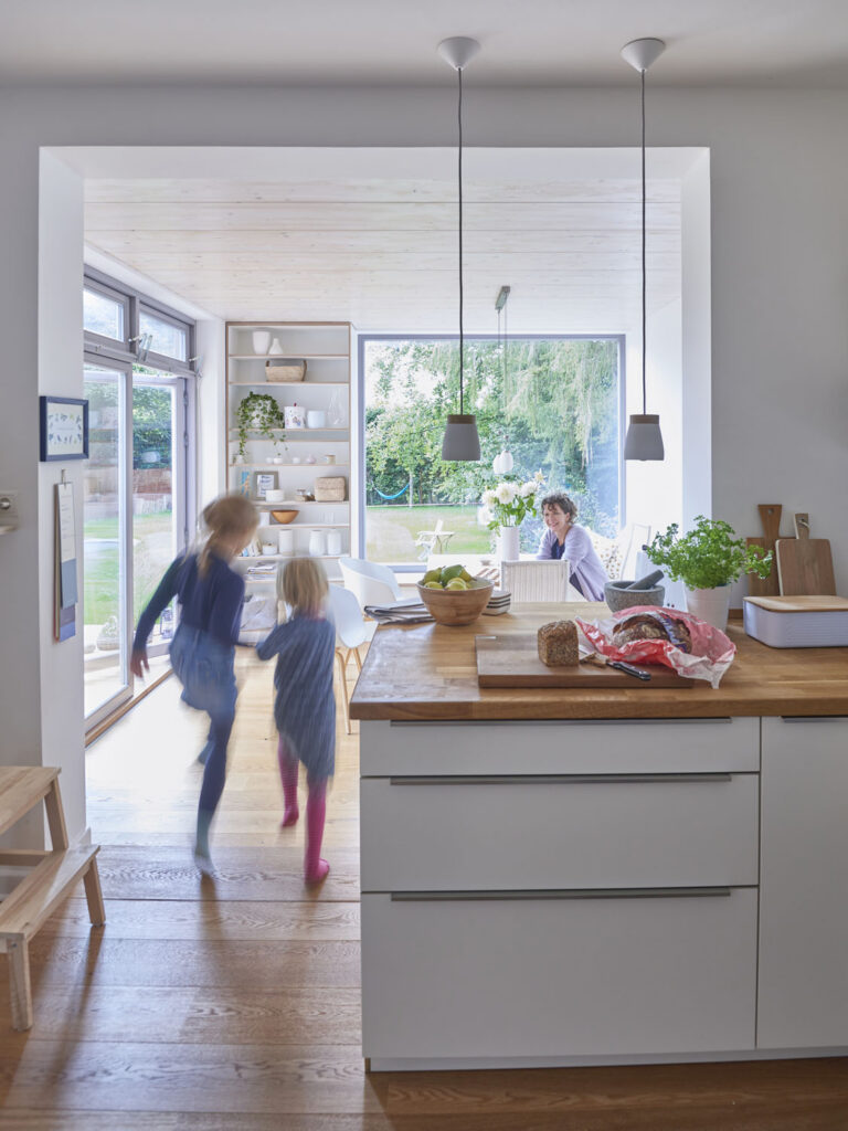 Auch wenn mit der Wahl neuer Holzfenster mit schmalen Profilen, der Farbe des Ziegeldachs und weißen Außenputzflächen grundsätzlich die äußere Optik des Bestandgebäudes bewahrt werden konnte, so wurden die „inneren Werte“ des Hauses umfangreich modernisiert. Neben einer zeitgemäßen Wärmedämmung sorgt nun eine Brennwerttherme für angenehme Temperaturen; in Anbau, Dachgeschoss und allen Bädern erfolgt das durch eine Fußbodenheizung. Da die Familie Wert auf möglichst viel natürliche Materialien legten, sind alle Fenster und Dachfenster, die neuen Böden und die Terrasse aus Holz. Nach dem Kauf des alten Siedlerhäuschens dauerte es 14 Monate, bis die großen und kleinen Bewohner einziehen konnten. Sieben Monate wurde entworfen, getüftelt und die Sanierung geplant, weitere sieben Monate dauerte die Bauphase. Die Erweiterung und Modernisierung kostete etwa 300.000 Euro.